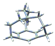 Here we present a small study using Gaussian and GaussView illustrating how the two may be used in combination to investigate molecular systems. The NMR shielding density for the methine proton of in-[3(4,10)] [7] metacyclophane is shown below (surface on the right), plotted on an isosurface of current density magnitude. (The molecule itself is pictured at the left.) Shielding density increases from red (deshielding) to blue (shielding). It was computed using Gaussian's NMR facility and visualized in GaussView. The current density, which determines NMR shieldings by the Biot-Savart law, is induced by an external magnetic field parallel to the C3 axis and leads to an unusually large shielding of the methine proton. In accord with the classic ring current model, this result is primarily due to the strong diamagnetic phenyl ring currents and the location of the methine proton, which is calculated to be only 1.70 Angstroms above the phenyl ring. The calculated shielding anisotropy for the methine proton is 23.9 ppm while the calculated isotropic chemical shift is -4.4 ppm relative to TMS, in good agreement with the experimental value of -4.0 ppm.