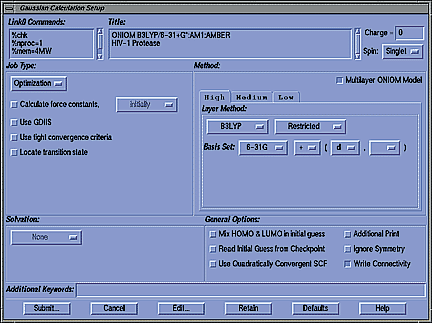 GaussView's Gaussian Calculation Setup window allows you to specify any type of Gaussian calculation in a simple, straightforward manner. All of the features of Gaussian 98 are supported by the GaussView interface.