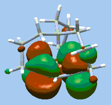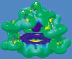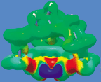 Here we present a small study using Gaussian and GaussView illustrating how the two may be used in combination to investigate molecular systems. The NMR shielding density for the methine proton of in-[3(4,10)] [7] metacyclophane is shown below (surface on the right), plotted on an isosurface of current density magnitude. (The molecule itself is pictured at the left.) Shielding density increases from red (deshielding) to blue (shielding). It was computed using Gaussian's NMR facility and visualized in GaussView. The current density, which determines NMR shieldings by the Biot-Savart law, is induced by an external magnetic field parallel to the C3 axis and leads to an unusually large shielding of the methine proton. In accord with the classic ring current model, this result is primarily due to the strong diamagnetic phenyl ring currents and the location of the methine proton, which is calculated to be only 1.70 Angstroms above the phenyl ring. The calculated shielding anisotropy for the methine proton is 23.9 ppm while the calculated isotropic chemical shift is -4.4 ppm relative to TMS, in good agreement with the experimental value of -4.0 ppm.