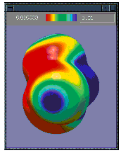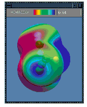 Surfaces may be displayed in solid, translucent and wire-mesh modes. Surfaces can also be colored by a separate property. For example the illustrations below show the electrostatic potential-painted charge density surface for chloroform in both the solid (left) and translucent (right) display modes: